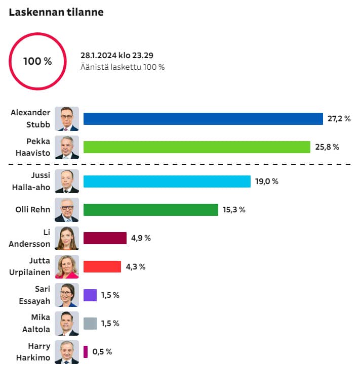За Стубба проголосовало 27,2% избирателей, а за Хаависто — 25,8%.